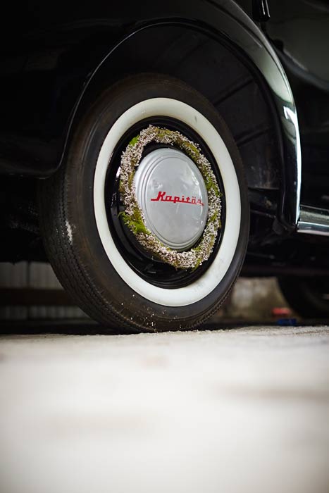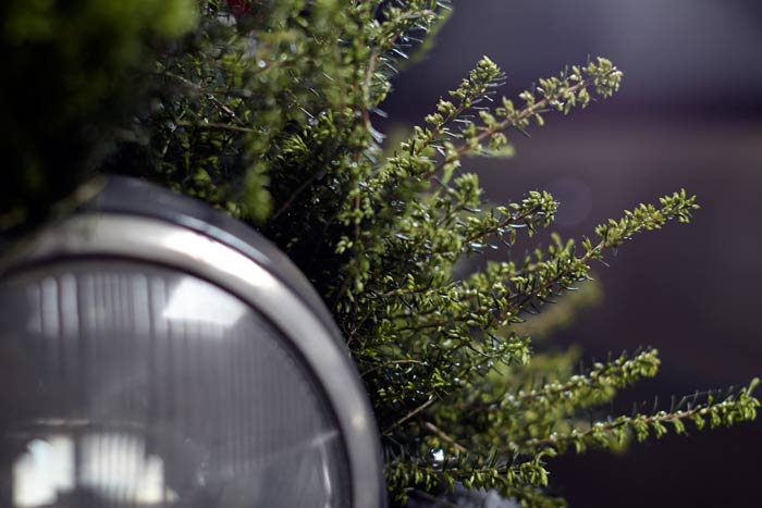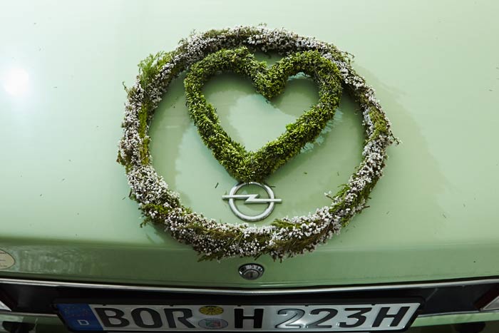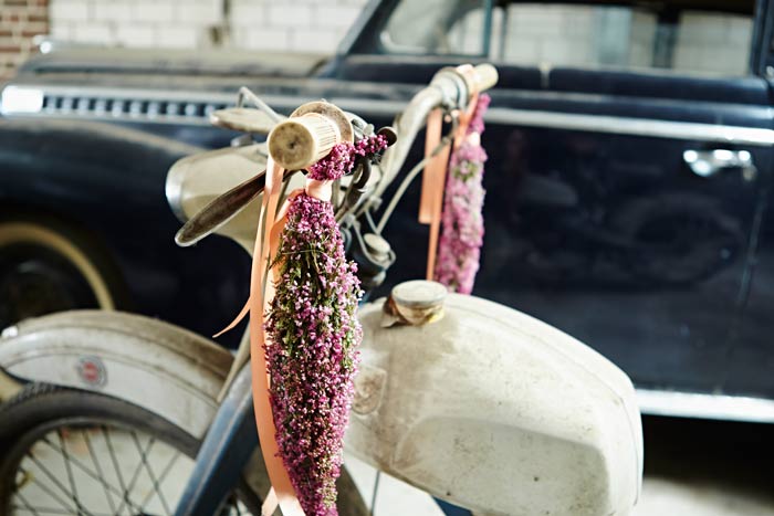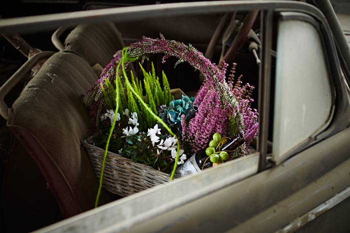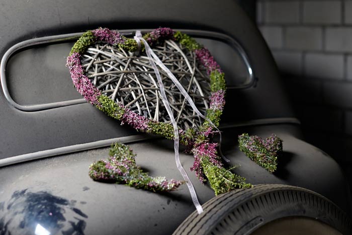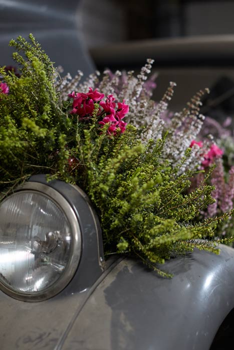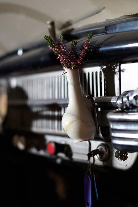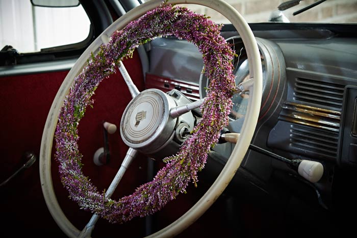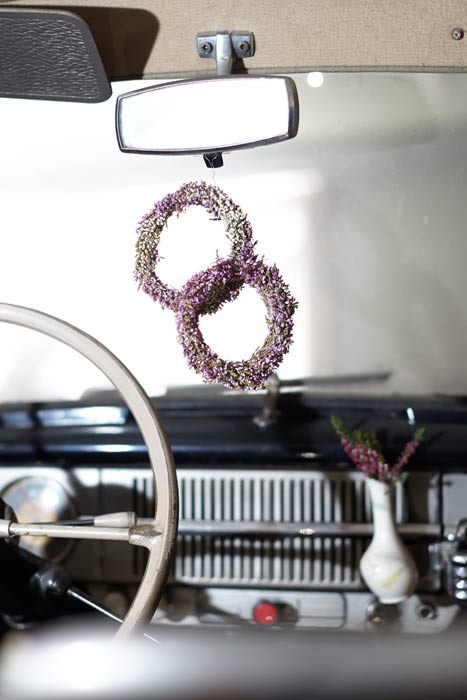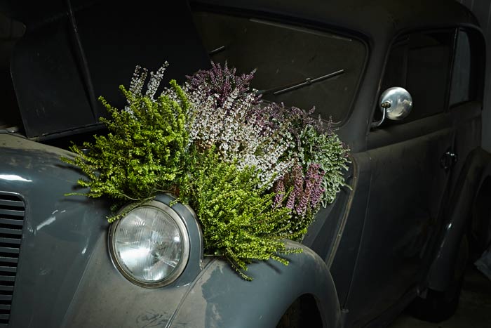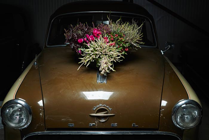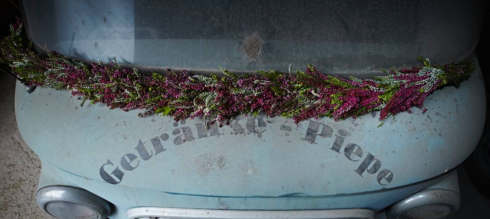 Auf einigen Bildern scheint es, als ob der Besitzer oder die Besitzerin das Auto gerade abgestellt und dabei nur vergessen hätten, eine Tasche mit Heide oder den Picknickkorb vom letzten Ausflug mitzunehmen. Auch die Glücksbringer aus Heidekränzen am Rückspiegel, am Armaturenbrett oder die Dekorationen an Reifen und Lenkrädern werten die alten Schätzchen auf. Gedanken an glückliche Zeiten rufen die Heideherzen aus den langlebigen Callunen auf der Rückfront einer luxuriösen Opel-Kapitän-Limousine hervor. Hat sie ein Brautpaar nach der Hochzeitsreise vergessen und zurückgelassen? Wie war die erste Tour mit dem Motorrad? Die beeindruckenden Fuchsschwänze am Lenker sind hier aus Heide nachgebildet.