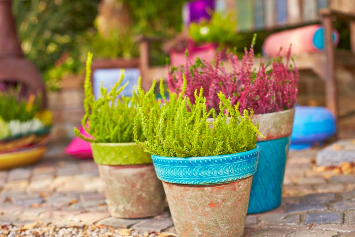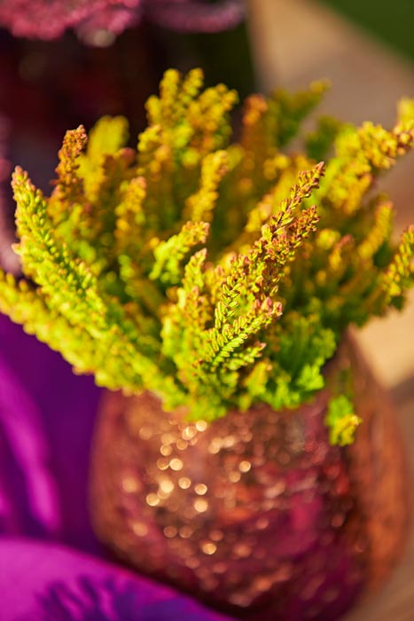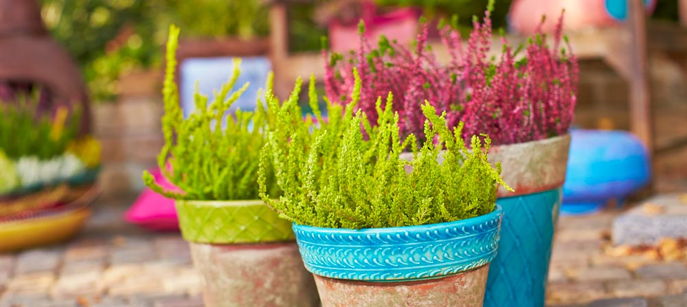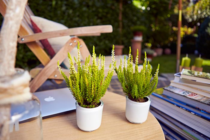Auch die Zusammenpflanzung von Heide liegt im Trend. Bis zu fünf verschiedene Sorten werden dafür in einem Topf aufgezogen. Dadurch lassen sich sowohl harmonische Kombinationen aus Weiß-, Rosa- und Rottönen erschaffen, als auch Mischpflanzungen in Kontrastfarben, beispielsweise in Schwarz-Rot-Gold.