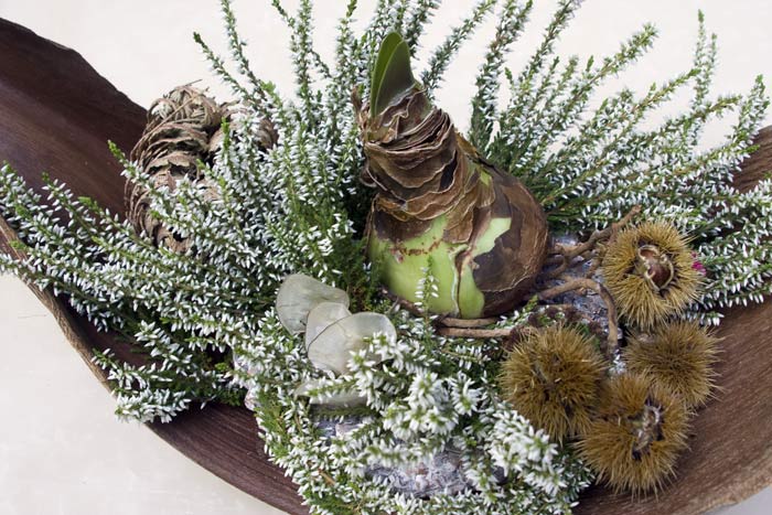- natürlichen Materialien wie Holz, Rinden, Moos, Steine und Zapfen, Mini-Kürbisse und Zierobst