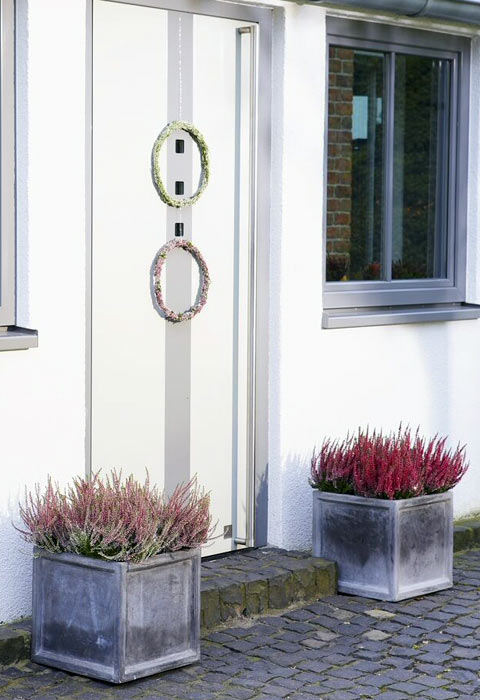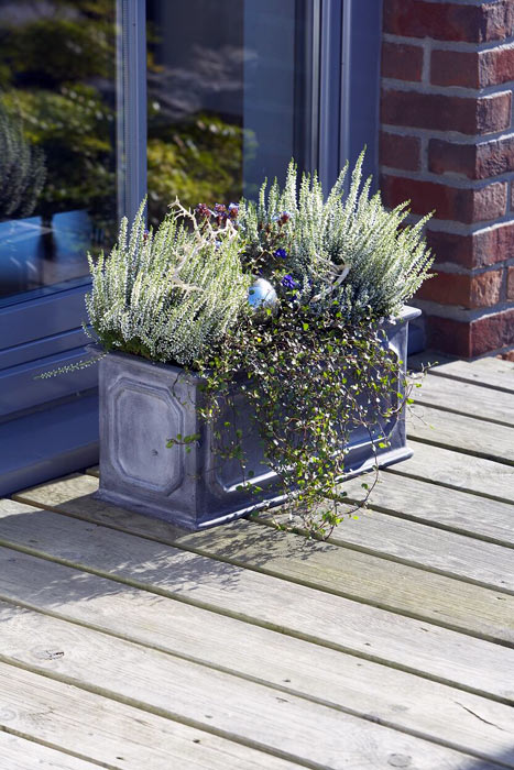 Besonders professionell wirkt dieKübel-Bepflanzung, wenn verschieden hohe und auch hängende Pflanzen verwendet werden. Als Schutz vor scharfem Wind eignen sich immergrüne Koniferen. Das i-Tüpfelchen erhält die Bepflanzung durch Accessoires wie Äpfel, Kastanien, Physalis, Minikürbisse, Hagebutten, Ziergurke, gebleichte Äste oder Filzelemente.