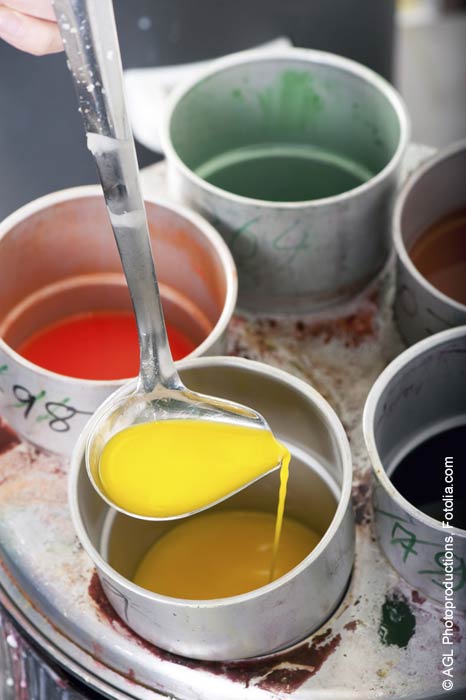 Das Wachs wird nun, nach Farben sortiert in die Dosen gegeben. Die Dosen dann in einen Topf mit Wasser stellen und das Wasser langsam erhitzen, so lange bis das Wachs anfängt zu schmelzen. Der Schmelzpunkt liegt bei etwa 60 Grad. Niemals das Wachs in einem Topf direkt erhitzen, da sonst die Gefahr der Selbstentzündung gegeben ist.