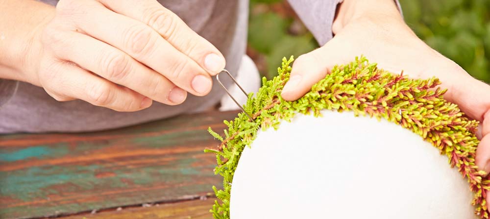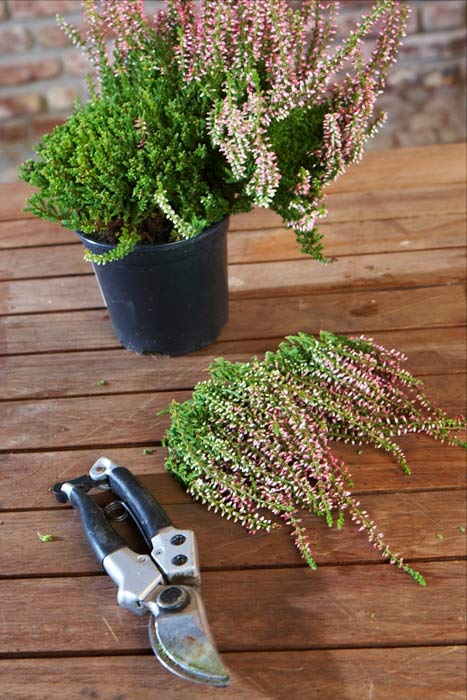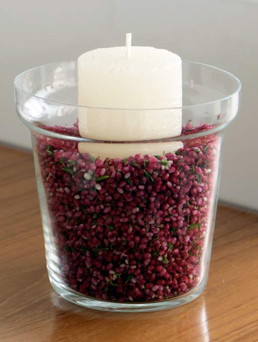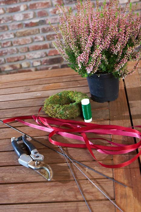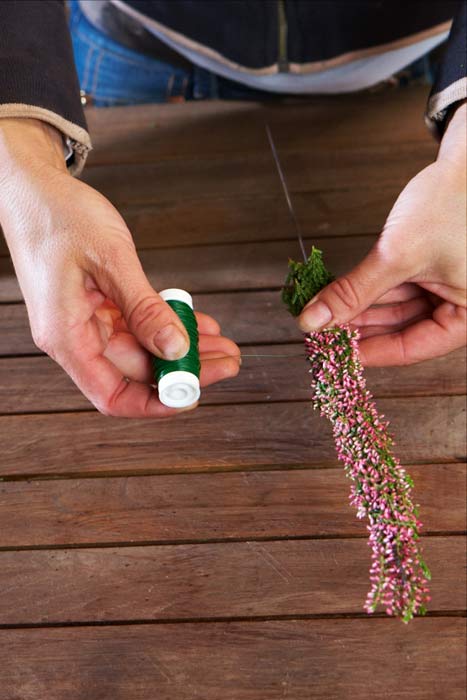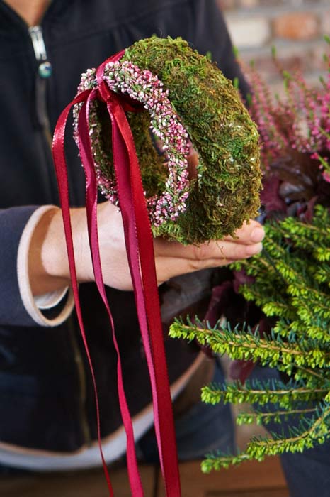 Viele intensive Farben, eine einfache Verarbeitung und lange Haltbarkeit: Callunen und Eriken sind der ideale Werkstoff für Menschen, die gerne basteln. Unter den verschiedenen Heidearten sticht dabei besonders Calluna vulgaris hervor, denn ihre Knospen trocknen besonders gut ein und behalten so lange ihre Farben. Mit wenigen Materialien, wie zum Beispiel Silber- oder Golddraht, Styroporkugeln oder Strohrömern, die sich in jedem Geschäft für Bastelbedarf finden, können schnell und unkompliziert eigene kreative Ideen umgesetzt werden. Alles beginnt mit den Heidezweigen, die möglichst dicht über den Wurzelballen der Pflanze abgeschnitten werden. Mit feinem Dekodraht zu kleinen Büscheln gewickelt und dann in – vorher gewässerte – Steckmasse gedrückt, können sie der Ausgangspunkt für originelle Gestecke und Tischdekorationen sein. Oder aber man umwickelt Gegenstände wie Strohkränze und Windlichter direkt mit den Heidezweigen. Wenn die Pflanze etwas eingetrocknet ist, lassen sich auch die Heideknospen, die sich bei den Callunen artbedingt nicht öffnen, wie ein farbiges Granulat verwenden. Beispielsweise als Füllung für ein Windlicht oder man streut die Knospen auf eine vorher mit Klebstoff behandelte Oberfläche und schafft so individuelle Kunstwerke. Unsere Bildergalerie gibt Ihnen ein paar Tipps zum Basteln mit Heide. Viel Spaß beim selber Ausprobieren!